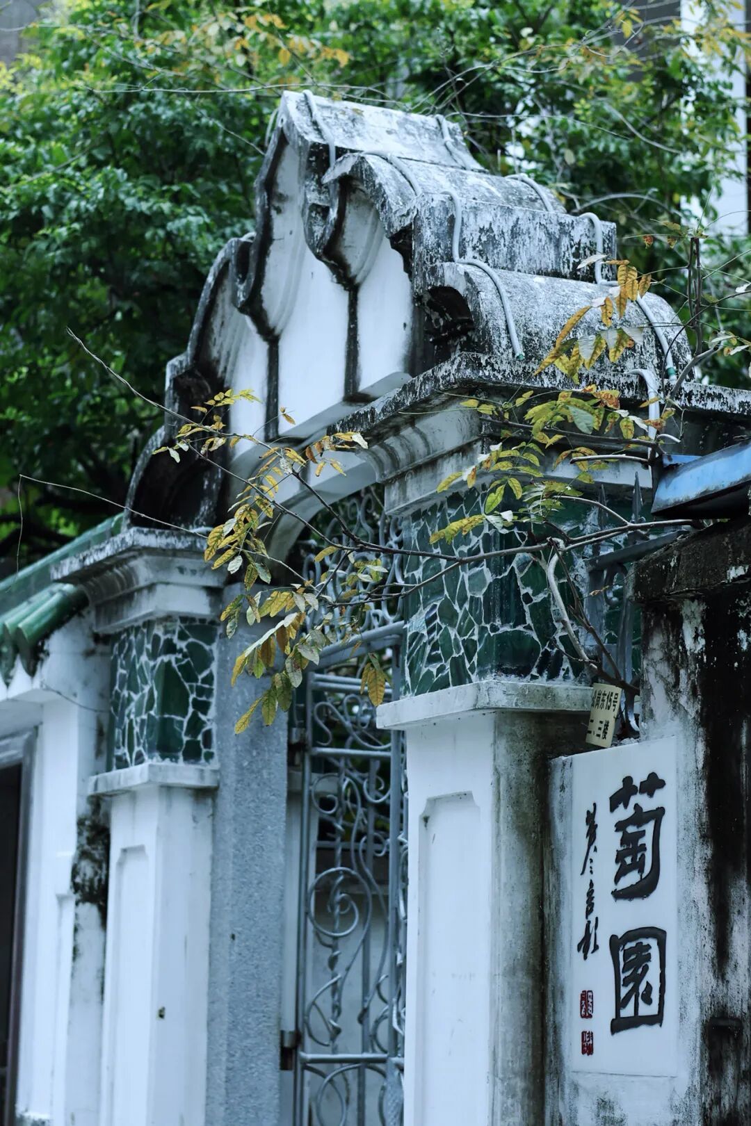 左右立柱,镶嵌的是细碎绿色琉璃瓦,铁门左侧,贴着“萄园”的一整面墙,满是斑驳痕迹,像是被谁拿着毛笔,随意挥洒了几笔。
